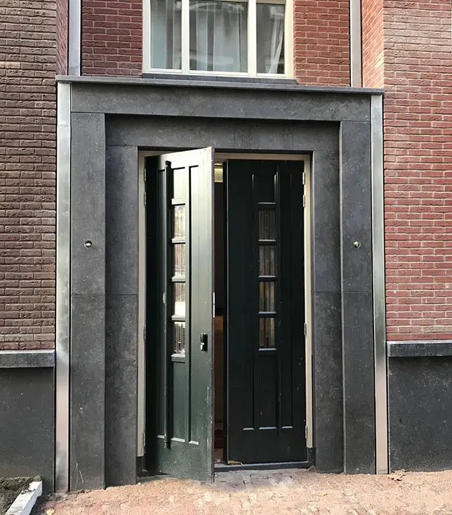 Voor de afwerking van de gevel wordt ook wel gekozen voor deur- en raamkaders van natuursteen. Deze kaders geven de woning een strakke uitstraling en legt het accent op de raam- of deurpartijen. Er wordt vaak gekozen voor natuursteen, omdat deze materialen glad en strak zijn en hierdoor minder vuil aantrekken in tegenstelling tot het vaak wat ruwere metselwerk. De kaders kunnen gecombineerd worden met raamdorpels of gevelbekleding in hetzelfde materiaal. Zo kan de gevel geheel in stijl worden uitgevoerd.